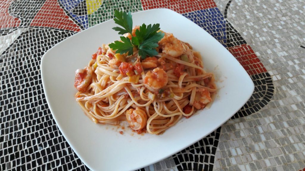 4. Προσθέτουμε στη συνέχεια τις γαρίδες και σβήνουμε τη φωτιά, ενώ παράλληλα βάζουμε τα μακαρόνια.