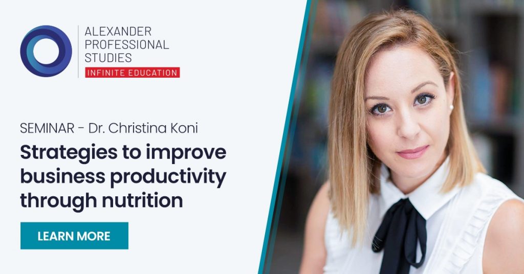 Το τμήμα επαγγελματικών σπουδών του Alexander College, ALEXANDER PROFESSIONAL STUDIES (APS), ανακοινώνει τη διεξαγωγή σεμιναρίου με θέμα «Στρατηγικές βελτίωσης της επαγγελματικής παραγωγικότητας μέσω της διατροφής», με ομιλητή την Δρ Χριστίνα Κονή, Διαιτολόγο, LD.